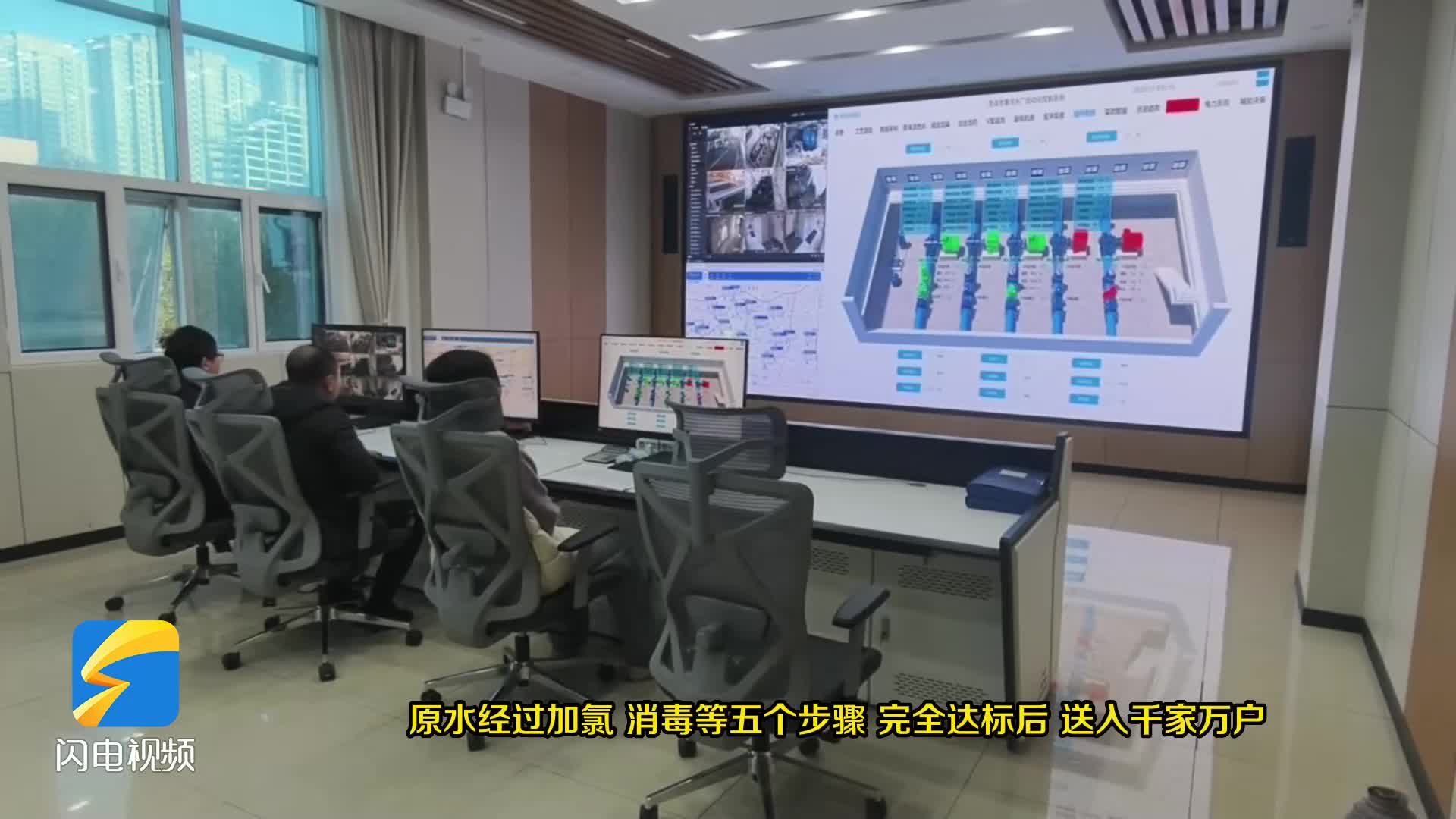 为筑牢水质安全第一道防线,全市各水厂均采用国内成熟的常规水处理工艺,原水进来后一共分为五个步骤,首先加入二氧化氯进行初步的消毒,强力灭杀水中的微生物,然后投加混凝剂,通过折板反应池进入平流沉淀池,通过沉淀池后,水中的浊度可以降低至3个NTU以下,最后进入滤池,通过十格滤池进行过滤,过滤后的水质在0.3NTU以下,最后通过提升泵房把水输送到千家万户。